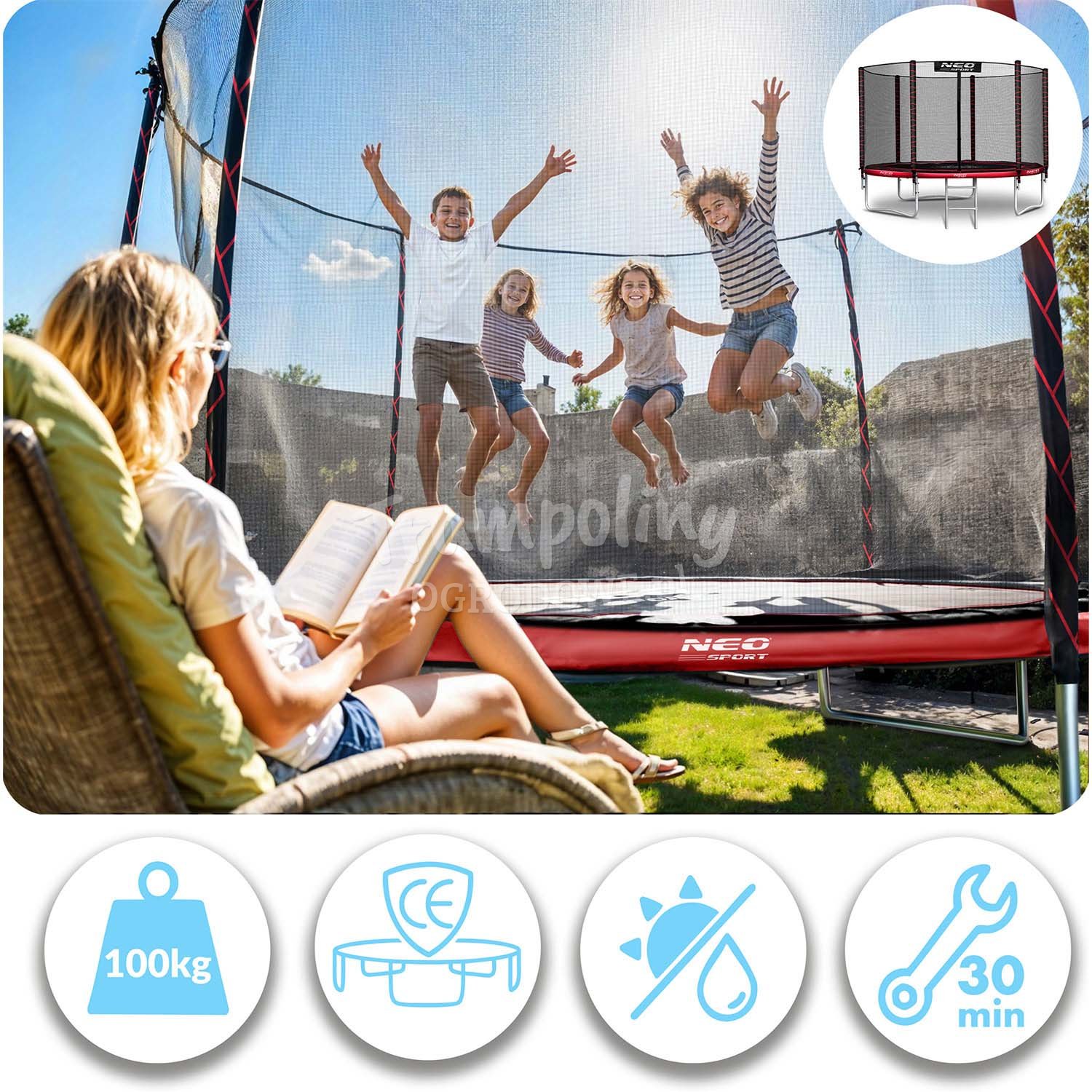 Trampolina NEO SPORT o imponującej średnicy 252 cm zapewnia mnóstwo miejsca do skakania – idealna dla dzieci i dorosłych!