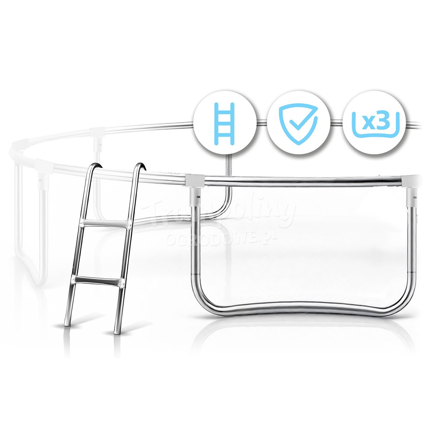 Drabinka z mocowaniem – solidna, metalowa i odpowiednio nachylona. Ułatwia bezpieczne wchodzenie i schodzenie, szczególnie dzieciom. Dzięki przemyślanemu kątowi nachylenia zapewnia wygodny dostęp do trampoliny.