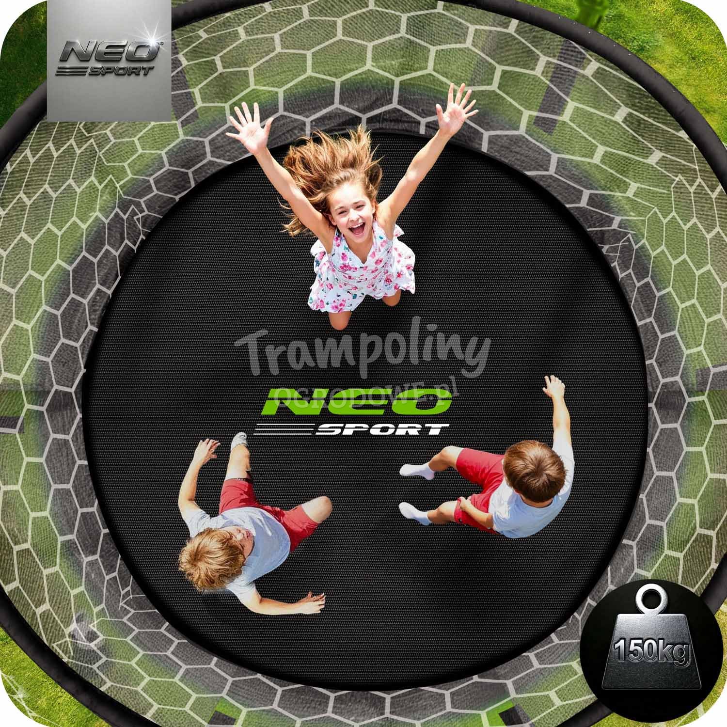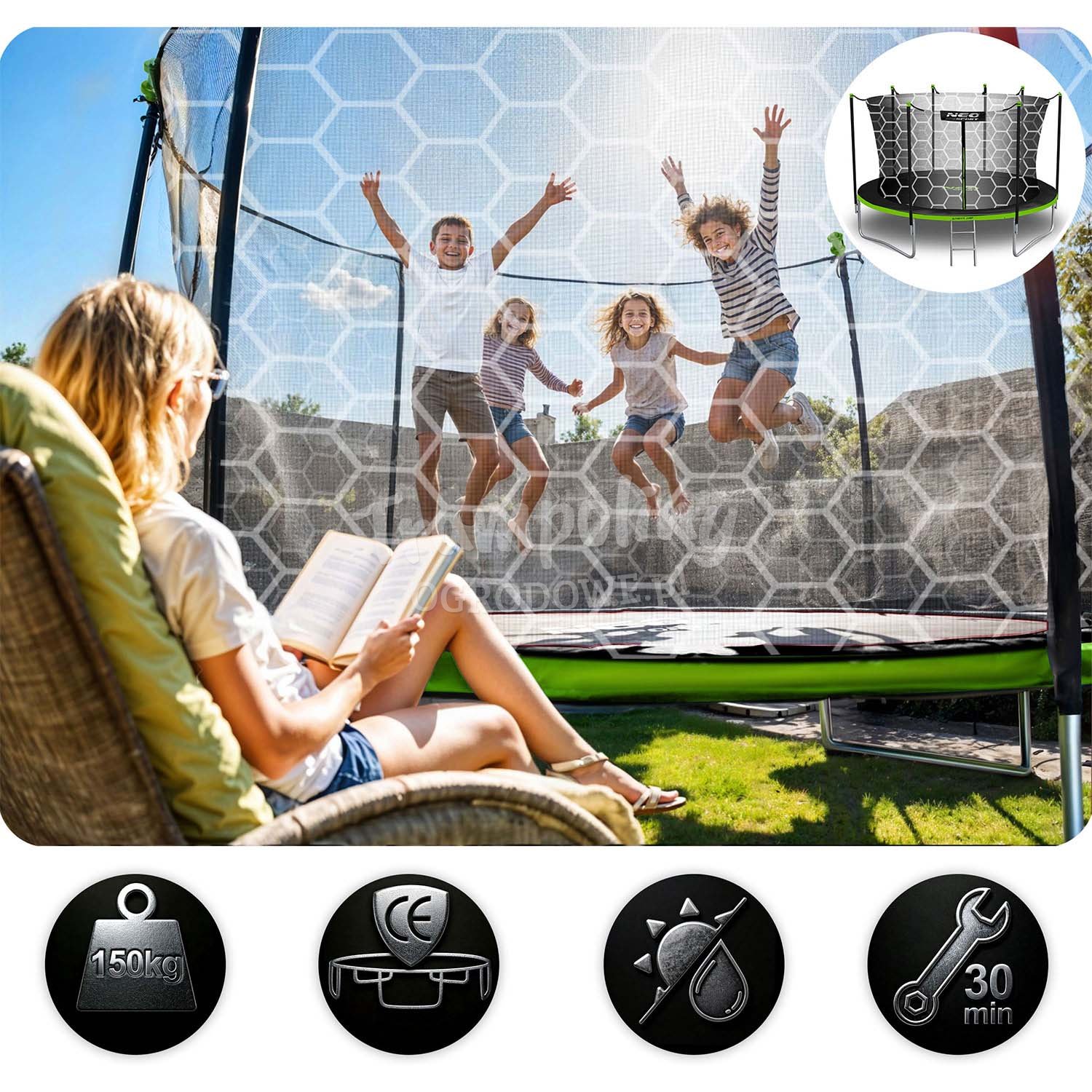 Trampolina NEO SPORT o imponującej średnicy 404 cm zapewnia mnóstwo miejsca do skakania – idealna dla dzieci i dorosłych!
