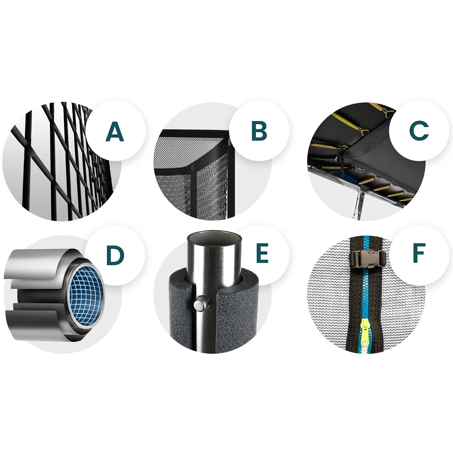 • Szybkoschnąca powierzchnia – wykonana z nowoczesnych materiałów powierzchnia nie zatrzymuje wilgoci, dzięki czemu trampolina jest gotowa do użytku w krótkim czasie po deszczu.